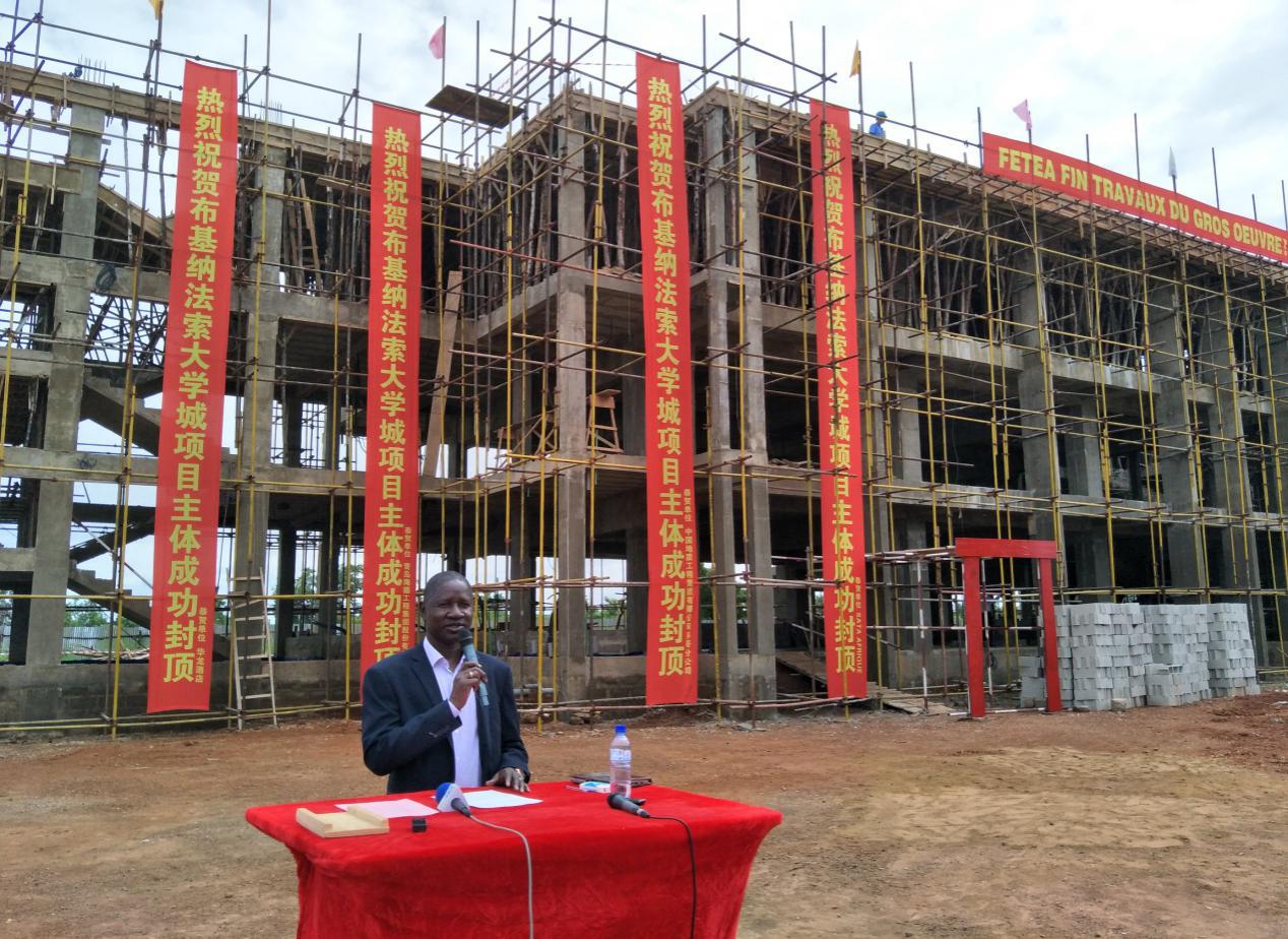 At the ceremony, project manager Wang Kaijun spoke first, he expressed his welcome and thanks to the Minister of Education, Counsellor Xu, university president, proprietor, supervision, quality inspection department and representatives of Chinese enterprises for attending the capping ceremony of the teaching building. He said: As the first project under construction since the resumption of diplomatic relations between China and Burkina Faso, it is our companys honor to participate in the construction of the second University Town project in Ouagadougou and contribute to the national construction of Burkina Faso. He also expressed his gratitude to all the staff involved in the construction of the project. Subsequently, the director of the supervision company, the president of the university and the Minister of Education gave speeches one after another, and they all gave high recognition and affirmation to the quality and speed of our project construction.The Minister of Education concluded by saying: President Kabore is currently attending the Beijing Summit of the Forum on China-Africa Cooperation in China, and the results will be remarkable. Believe that the University Town project is only the start of cooperation between China and Burkina Faso, looking forward to further cooperation in the future.