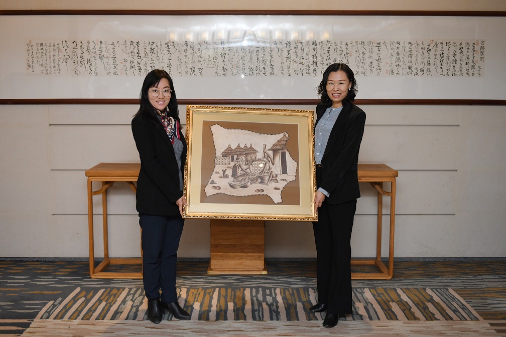 At 9 a.m., accompanied by Tian Guofeng and Pan Hebin, Chen Chunyan, Director of Jinan Dacheng Art Museum, led our group to visit Dacheng Art Museum in Jinan Urban Construction Group. Dacheng Art Museum is an artistic place and cultural industry project created by Jinan Urban Construction Group. It is open free to the public and art fans after the completion, which reflects the corporate social responsibility and participation in cultural construction. Curator Chen kept two traditional African paintings presented by my group in the museum.