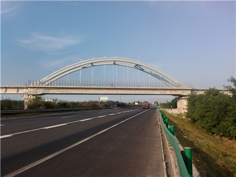 海青鐵路跨榮烏高速公路特大橋是海青鐵路全線特殊工跨(跨路施工)中,跨度最大,風險最高的一個,主跨(DK9+723.950~DK9+789.65)上部采用鋼管混凝土系桿拱結構,計算跨徑64m,梁長65.5m。