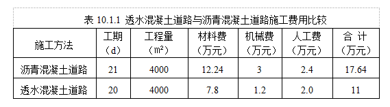 本工法因材料簡單,節(jié)約了大量的材料租賃費、人工費、機械費用,提高了施工質(zhì)量和施工進度。以紅島片區(qū)大洋一路道路及綜合配套工程自行車道為例,透水混凝土道路與瀝青混凝土道路施工費用對比見表10.1.1,可見透水混凝土道路施工成本較低,施工費用總工節(jié)約了6.64萬元。