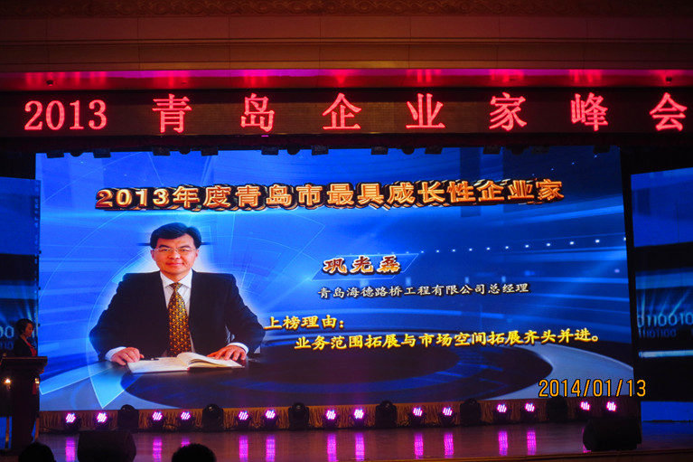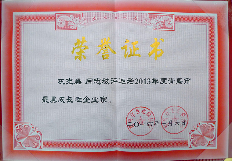 會(huì)議還表彰了2013年度(第十六屆)青島市優(yōu)秀企業(yè)家和最具成長(zhǎng)性企業(yè)家,發(fā)布了2013年度青島企業(yè)100強(qiáng)、制造業(yè)企業(yè)100強(qiáng)、服務(wù)業(yè)企業(yè)50強(qiáng)排行榜和首屆青島市社會(huì)責(zé)任示范企業(yè)名單。我公司總經(jīng)理鞏光磊榮膺青島市最具成長(zhǎng)性企業(yè)家的光榮稱號(hào)。