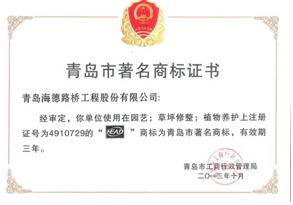 近日,由青島市工商局發(fā)文公示,根據(jù)《青島市著名商標(biāo)認(rèn)定和保護(hù)辦法》及有關(guān)規(guī)定,本單位使用在園藝、草坪修整、植物養(yǎng)護(hù)上注冊證號為4910729的“