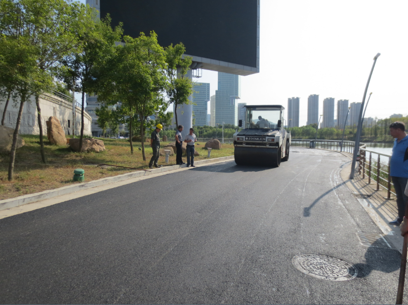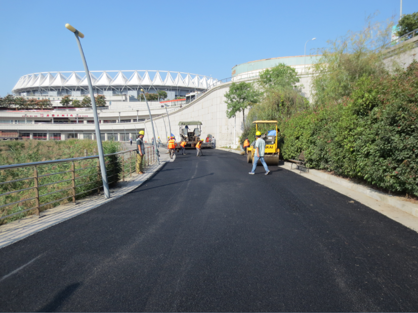 環(huán)湖路位于國信體育場游泳跳水館旁,道路全長625米,為體育場內(nèi)部主要道路之一。現(xiàn)狀道路面層為3cm厚彩色強固混凝土,起砂、破損嚴(yán)重,嚴(yán)重影響行車舒適性。本工程為舊路綜合整治工程,設(shè)計將車行道舊彩色透水混凝土面層進行銑刨,并鋪設(shè)3cm厚AC-10瀝青混凝土