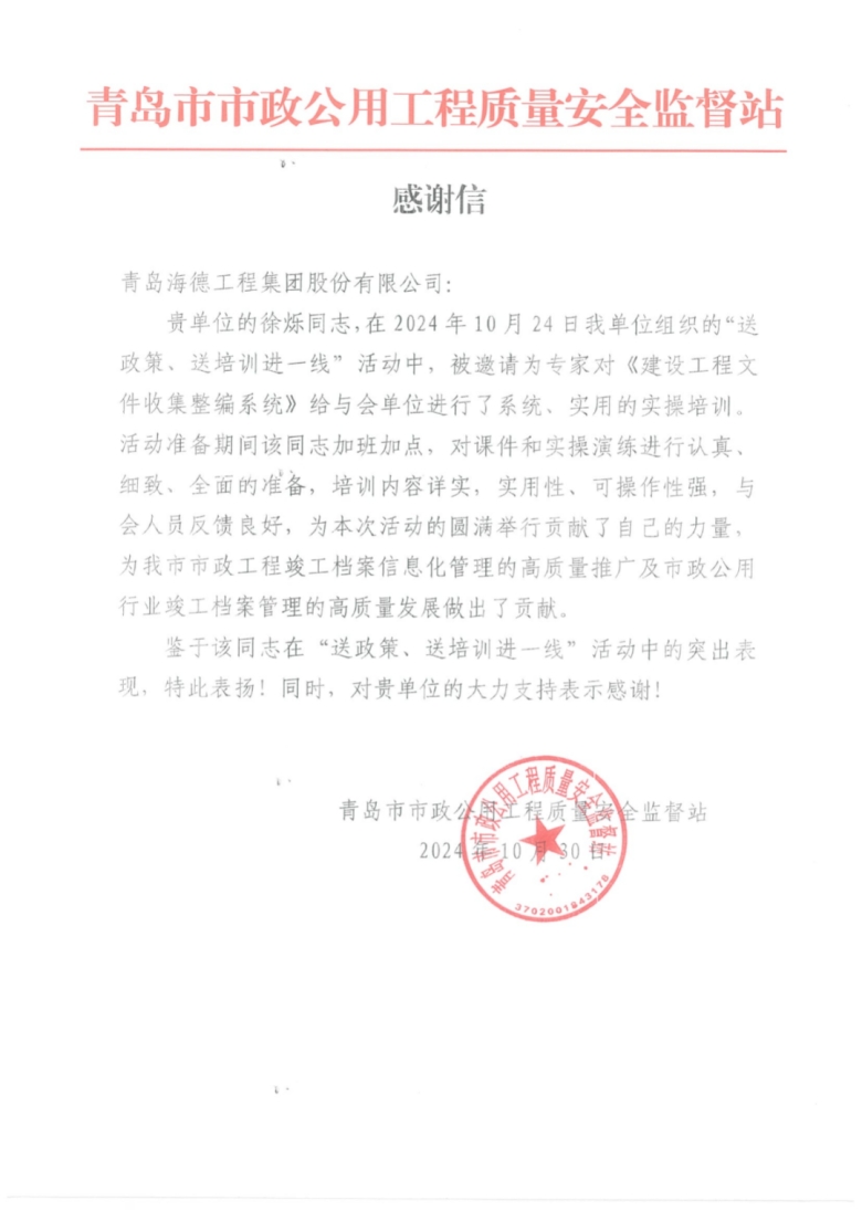 2024年10月30日,青島市市政公用工程質(zhì)量安全監(jiān)督站向集團發(fā)來表揚信,對于我集團員工徐爍在“送政策、送培訓進一線”活動中的突出表現(xiàn)給予表揚,對于集團對活動的大力支持表示感謝。
