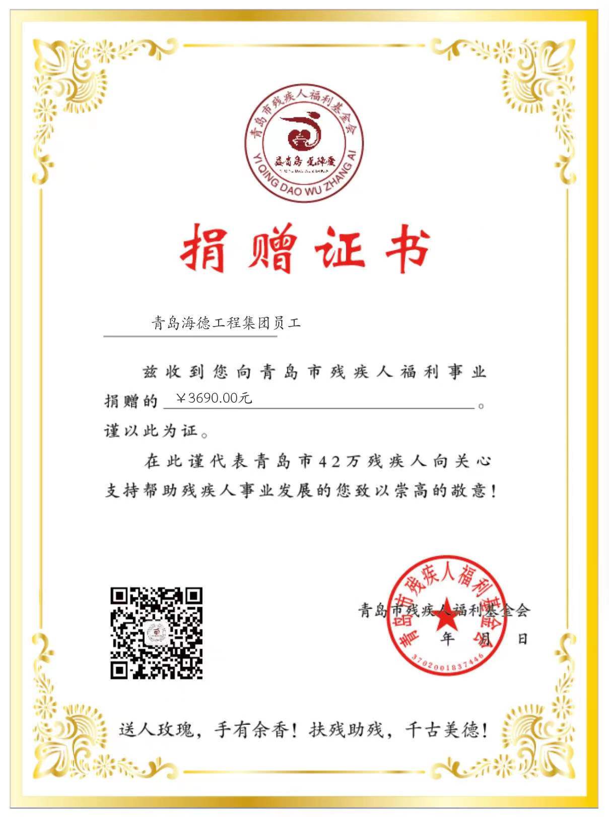 在新年到來(lái)之際,在辭舊迎新的歲月里,剛脫離貧困的殘疾人兄弟姐妹們?nèi)匀幻媾R著一些現(xiàn)實(shí)困難。為幫助殘疾人過(guò)一個(gè)歡樂(lè)祥和的新年,青島市殘疾人福利基金會(huì)發(fā)起了“我捐一點(diǎn)錢(qián),幫助殘疾人迎新年”活動(dòng),募捐款項(xiàng)將全部用于幫扶殘疾人解決日常生活、信息交流等方面的困難?;顒?dòng)發(fā)起后,集團(tuán)公司積極響應(yīng)號(hào)召,組織發(fā)動(dòng)員工捐款,共募得款項(xiàng)3690元。